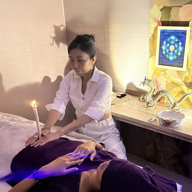 ヒーリングルームにてイヤーコーニング施術。